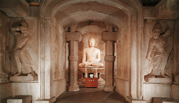 석굴암 내부에는 석가여래 좌상이 자리 잡고 있으며, 이 불상은 높이 약 3.4미터로 화강암으로 조각된 도상을 가지고 있습니다. 석굴암은 인위적으로 만들어진 화강암 석굴로, 내부는 중앙의 본존불을 중심으로 여러 조각상들이 신비롭게 배치되어 있습니다.