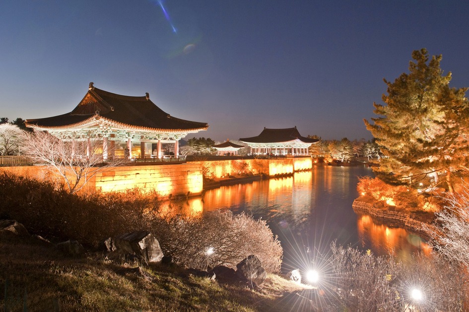밤에 조명이 켜진 안압지는 환상적인 분위기를 자아냅니다. 물에 비친 조명과 함께 낭만적인 산책을 즐길 수 있습니다.