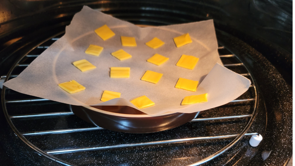 2) 종이 호일에 자른 체다 치즈를 적당한 간격으로 올려줍니다.