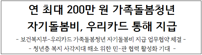 지난 5월 2일, 보건복지부와 우리 카드의 업무협약식을 통해, 연 최대 200만 원의 자기 돌봄비가 우리 카드를 통해 지급되는 것으로 결정되었습니다.