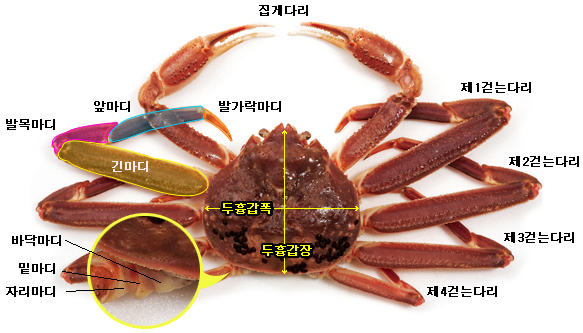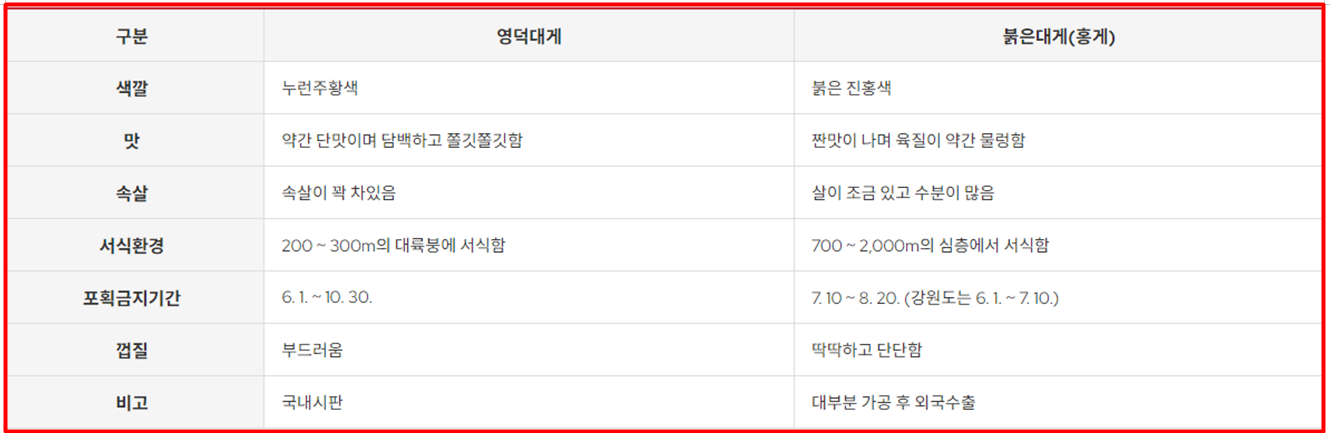 • 영덕대게 : 홍게에 비해 껍질이 부드럽고, 등쪽은 주황색에 가깝고 배쪽은 노란빛이 도는 흰색