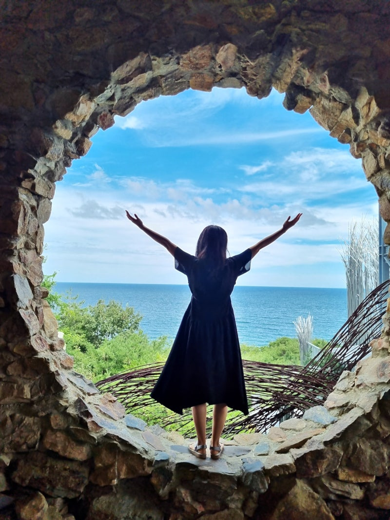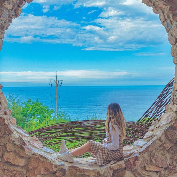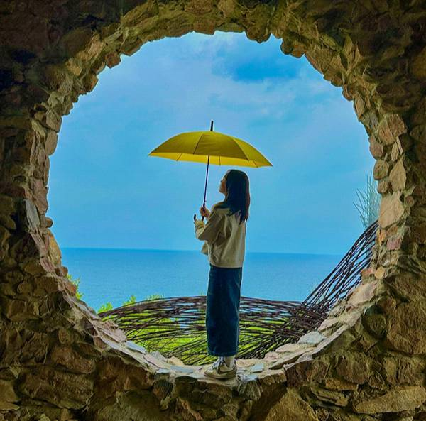 하슬라아트월드는 보이는 곳마다 모두 포토 존이라고 할 수 있을 정도로 예쁜 공간이 정말 많습니다. 그중에서도 가장 대표적인 포토 존은 피노키오 박물관 앞에 있는 곳인데, 동그란 구멍 너머로 보이는 파란 동해를 배경으로 사진을 남길 수 있습니다.