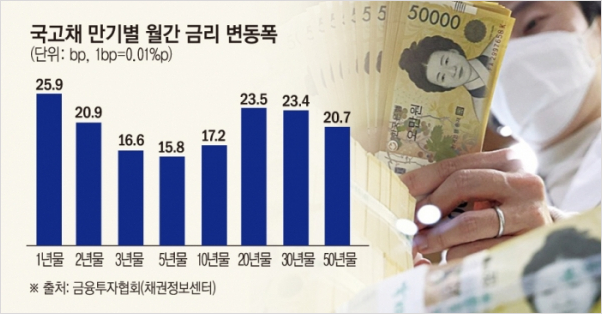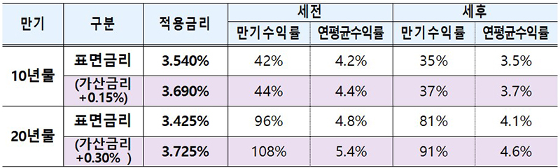 표면금리는 전월 발행한 동일 연물 국고채 낙찰금리(10년물 3.540%, 20년물 3.425%)를 적용하며, 가산금리는 최근 시장 상황 등을 고려해 10년물은 0.15%, 20년물은 0.30%를 적용할 예정입니다.