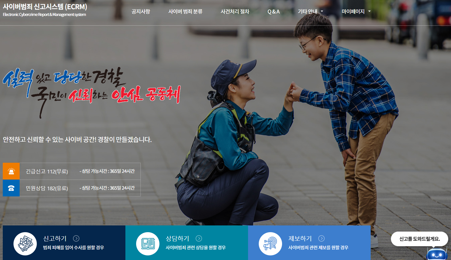 * 사이버범죄 신고시스템, ☎112(긴급 신고), ☎182(민원 상담) 혹은 홈페이지 방문