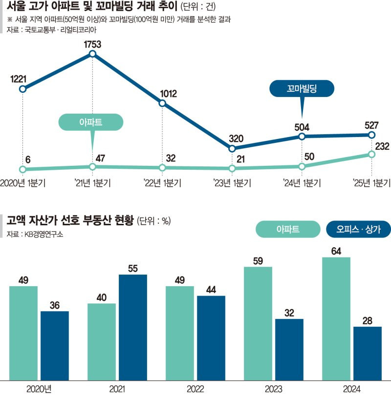 실제로 2023년을 기점으로 100억 원 미만 꼬마빌딩 거래는 급격히 줄어든 반면 50억 원 이상 아파트 거래는 폭증했습니다.
