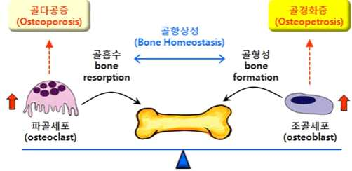 우리 뼈에는 조골세포와 파골세포가 있는데, 이 중에서 파골세포는 혈액의 칼슘이 부족하거나 오래된 뼈를 새 뼈로 교체할 때 뼈를 분해하는 세포이고, 조골세포는 반대로 뼈를 생성하고 재생하는 세포입니다. 이처럼 우리 뼈는 조골세포와 파골세포의 상호작용으로 유지되고 재생되고 있습니다.