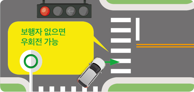 ▷ 우회전 신호등이 없는 경우 : 신호등이 '적색'일 때 꼭 '일시 정지' 후 우회전