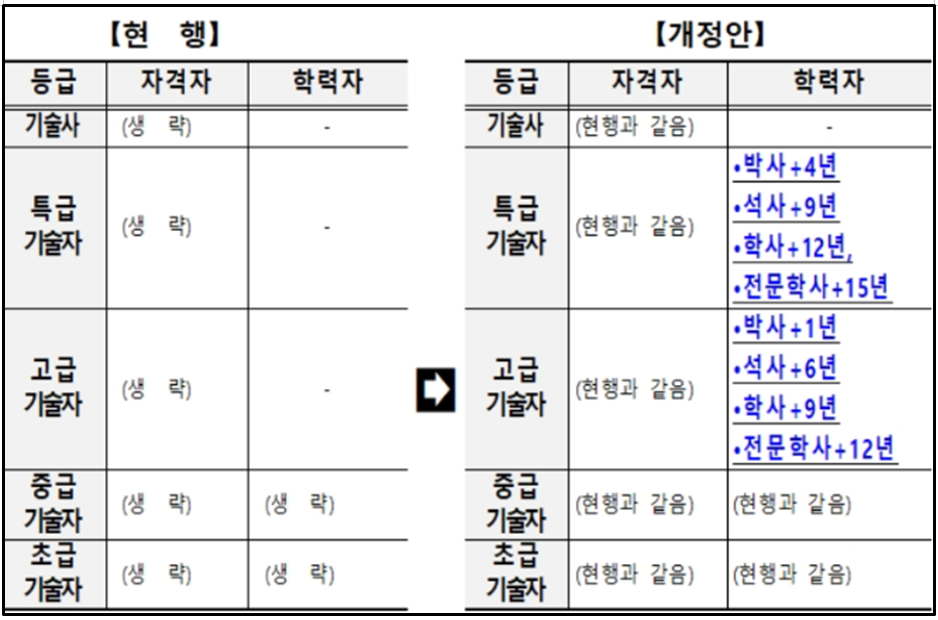 국가 기술 자격자가 아닌 학력·경력 기술자는 중급까지만 승급이 가능했으나, 실무 경험이 풍부한 경우 고급·특급 기술자로 승급할 수 있도록 해, 우수한 기술 인력을 유입할 수 있도록 하고 산업 경쟁력을 강화했습니다.