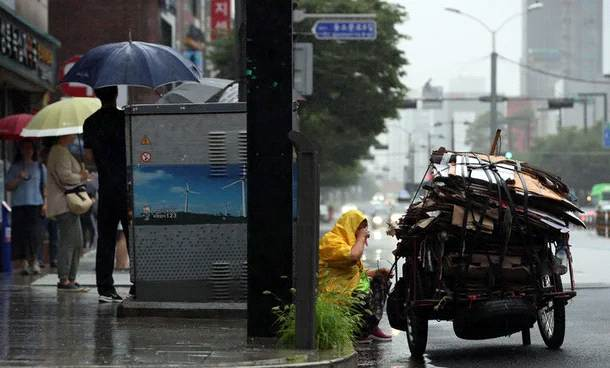 억수로 쏱아지는 비를 맞으며 길거리 한모퉁이에서, 잠깐의 휴식시간을 갖고 있는 폐지줍는 어느 사람의 모습에서 힘든 사람들이 더 힘든 요즘의 실상을 봅니다.