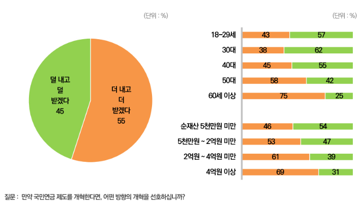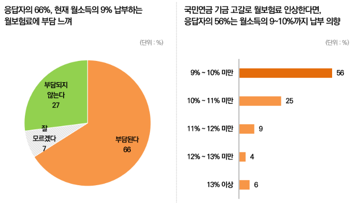 * 국민연금 보험료율을 현행 9%에서 13%로 올리고, 소득대체율도 40%(2028년 기준)에서 50%로 높이는 방안(1안)이, 시민대표단 492명 중 56.0%의 선택을 받아 더 높은 선호도를 보였다고 발표