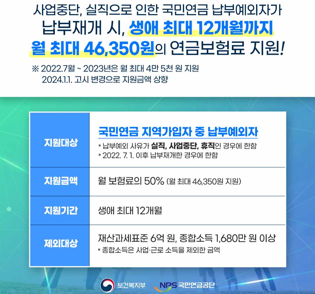 저소득 지역 납부예외자 중 연금 보험료를 납부를 다시 시작하는 분들(납부 재개)에게 보험료 일부를 지원하여 연금 사각지대를 해소하고, 노후 소득 보장을 강화하기 위한 제도입니다.