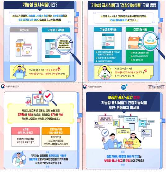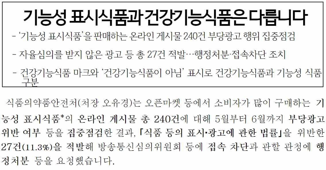 식약처는 오픈마켓 등에서 소비자가 많이 구매하는 기능성 표시식품의 온라인 게시물 총 240건에 대해, 5월부터 6월까지 부당광고 위반 여부 등을 집중점검 하였습니다.
