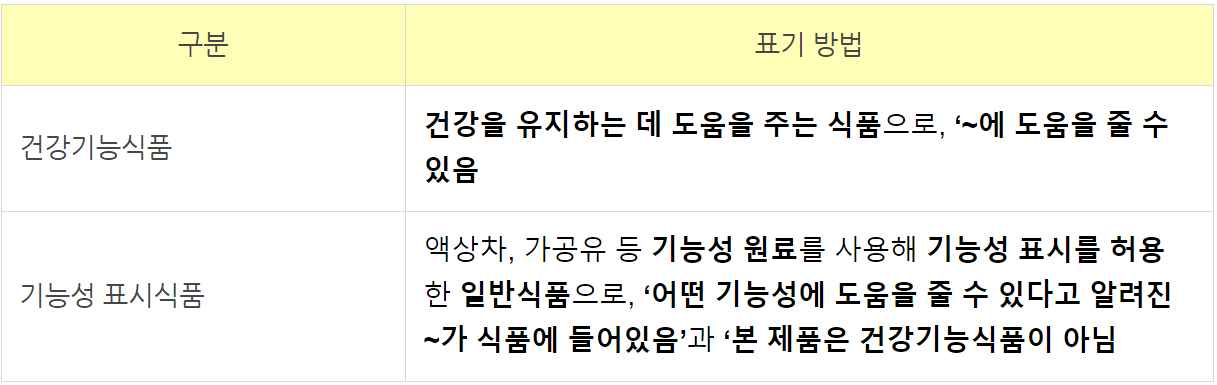 - 기능성 표시 식품은, 식약처에서 인정받은 기능성 원료를 사용해 과학적 근거를 갖춘 경우, 제품에 기능성 표시를 허용한 요구르트, 음료, 두부 등의 '일반식품'