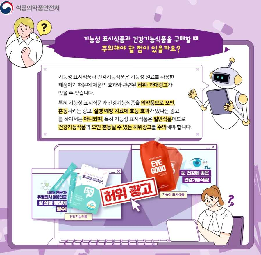 - 특히 기능성 표시식품과 건강기능식품을 의약품으로 오인, 혼동시키는 광고, 질병 예방・치료에 효능・효과가 있다는 광고 표기 불허