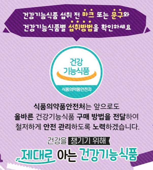 아무리 건강에 좋은 식품이라도 적절하게 섭취해 주는 것이 중요하며, 건강 기능식품 섭취 전 마크 또는 문구와 건강기능식품별 섭취 방법을 확인하여야 합니다.
