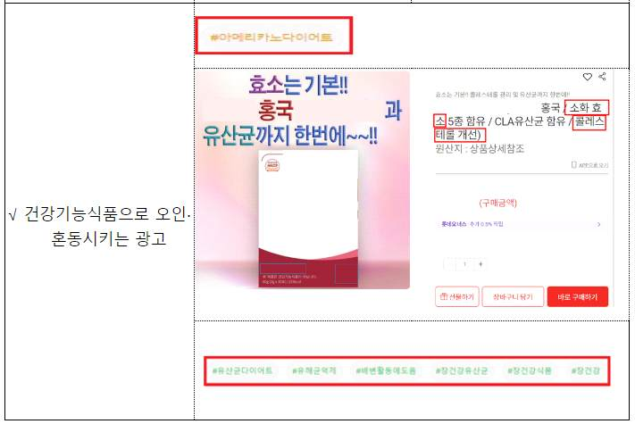 이번 주요 위반 내용은 기능성 표시 식품임에도 사전에 자율심의를 받지 않은 광고(22건, 81.5%)나 일반식품을 건강기능식품으로 오인‧혼동시키는 광고(5건, 18.5%)입니다.