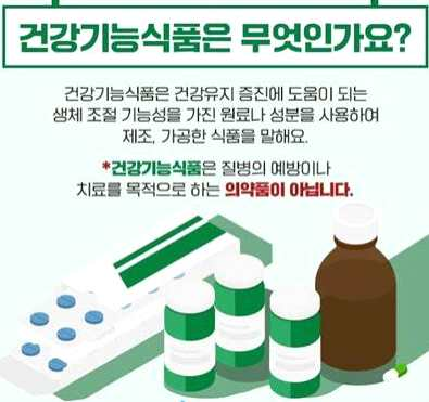 - 건강기능식품은 '건강기능식품에 관한 법률'에 따라, 일정 절차를 거쳐 만들어지는 제품으로서 '건강기능식품'이라는 문구 또는 인증마크 표기
