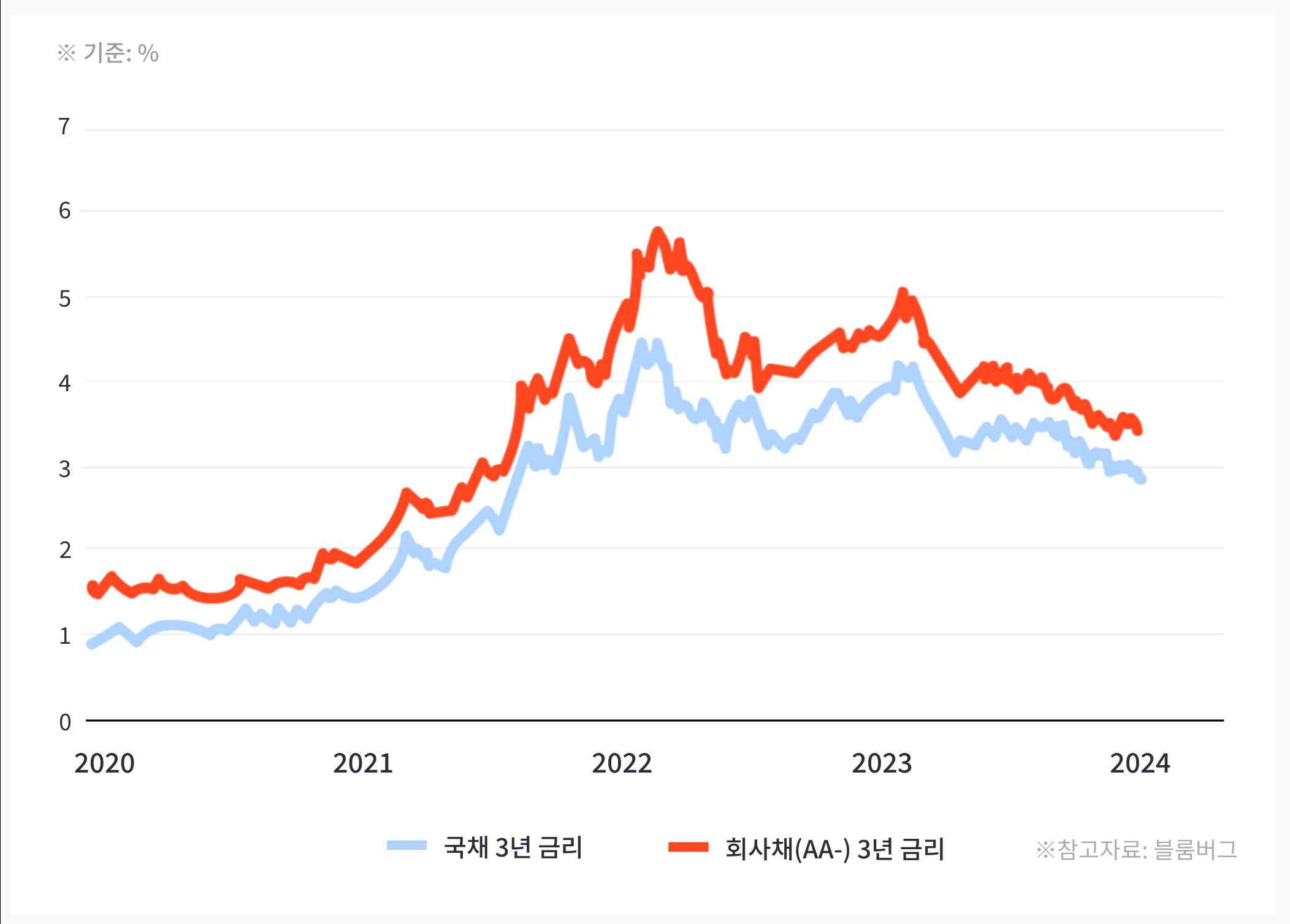 * 국채 3년 금리와 회사채(AA-) 3년 금리와의 비교