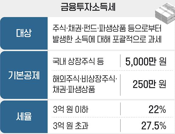 2023년에 시행 예정이었던 금융투자소득세는 2025년 1월 도입을 앞두고 여야가 다투고 있습니다. 현재 정부는 금투세를 폐지하자는 입장이지만, 야당은 금투세를 보완 후 시행해야 한다는 입장입니다.