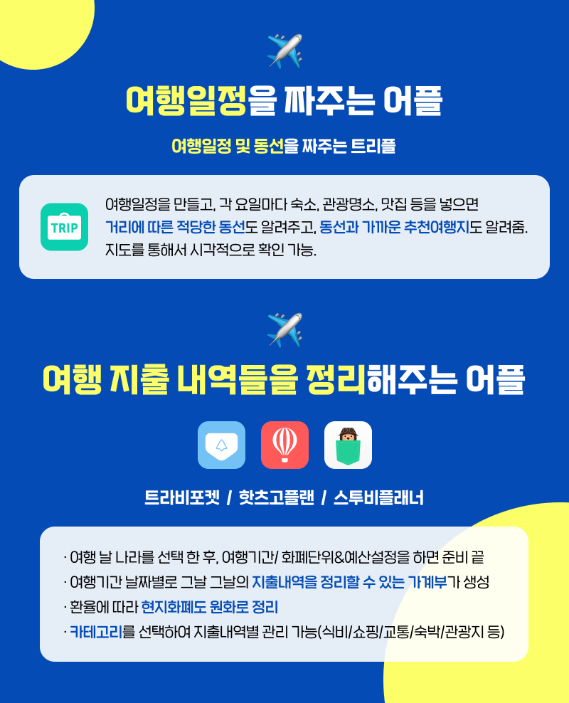 ▶ 여행 지출 내역들을 정리해 주는 어플로 '트라비포켓', '핫츠고 플랜' , '스투비플래너'가 있음