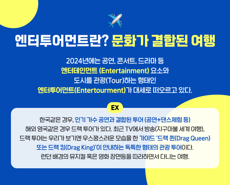 - 공연, 콘서트, 드라마 등 엔터테인먼트 요소와 도시를 관광 투어하는 형태를 합쳐 만든 여행상품