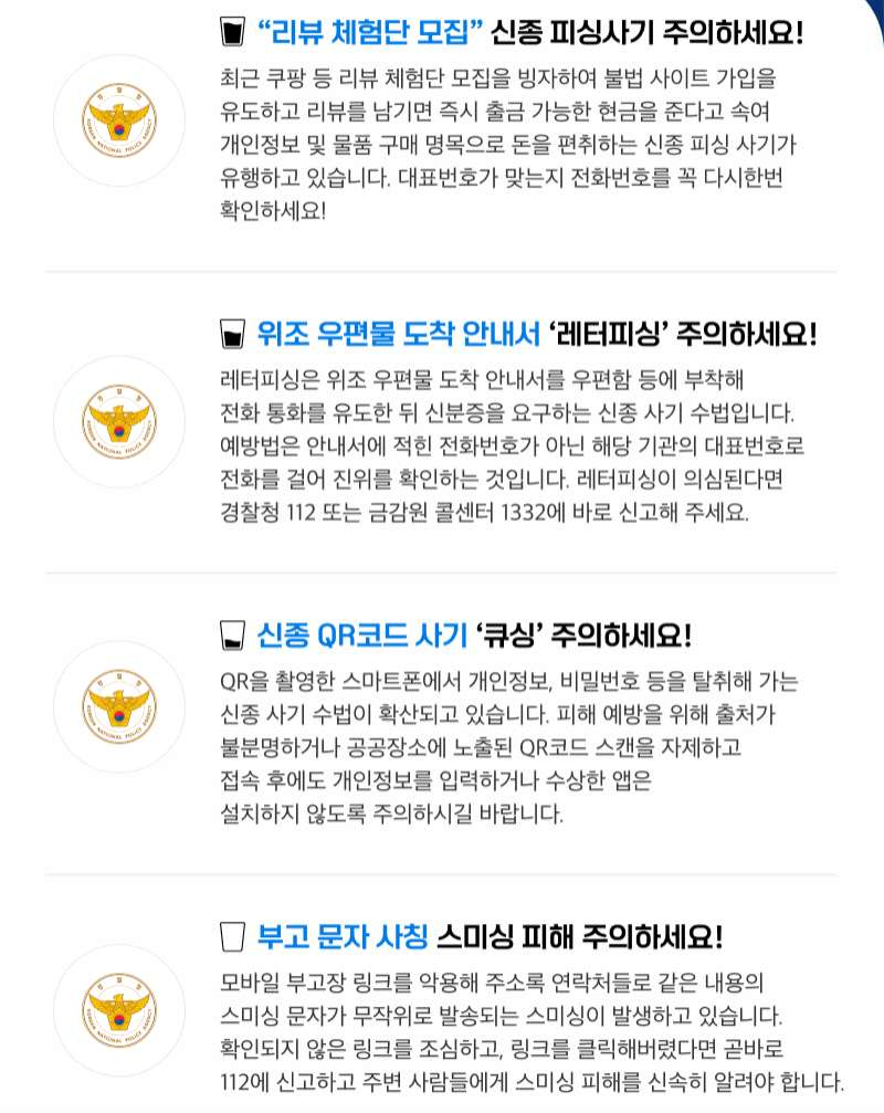 정부와 공공기관은 개인정보와 재물을 요구하지 않습니다. 또 수사기관은 앱 설치 또는 특정 사이트에 접속해 인적 사항 입력을 요구하지 않습니다. 레터 피싱이 의심된다면 경찰청 112 또는 금감원 콜센터 1332에 바로 신고해 주시길 바랍니다.
