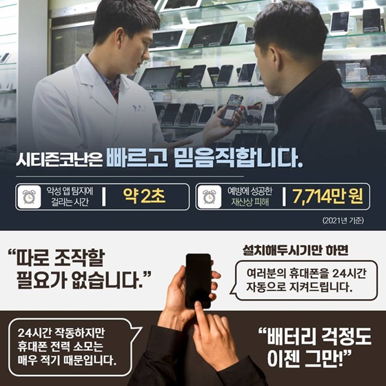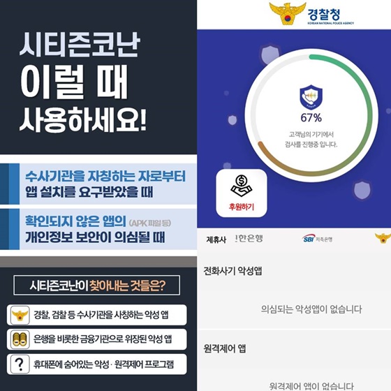 경찰청이 운영하는 '시티즌 코난' 앱으로, 내 폰에 깔려있을지도 모를 악성 프로그램을 정확히 잡아낼 수 있고 하니 여러분에게 소개해 보겠습니다.