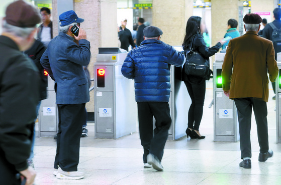 관련 법규에 따라 만 65세 이상 노인, 장애인, 국가유공자가 지하철 무임승차 혜택을 보고 있으며, 전체 무임승차 승객의 80% 가까이가 노인인 것으로 파악되었습니다.