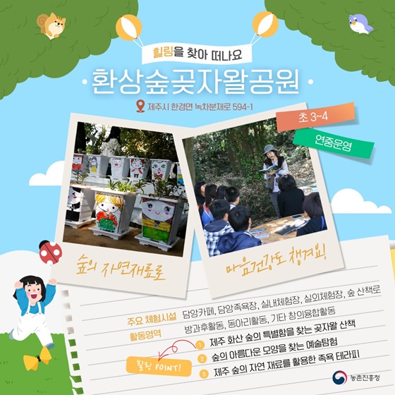 환상 숲 곶자왈 공원은 제주 화산 숲의 특별함을 느낄 수 있는 숲 산책로가 있는 곳입니다. 숲의 아름다운 모양을 찾는 예술탐험과 제주 숲의 자연 재료를 활용한 족욕 테라피도 체험할 수 있습니다. 숲의 자연 재료로 마음 건강도 챙겨보시길 바랍니다.