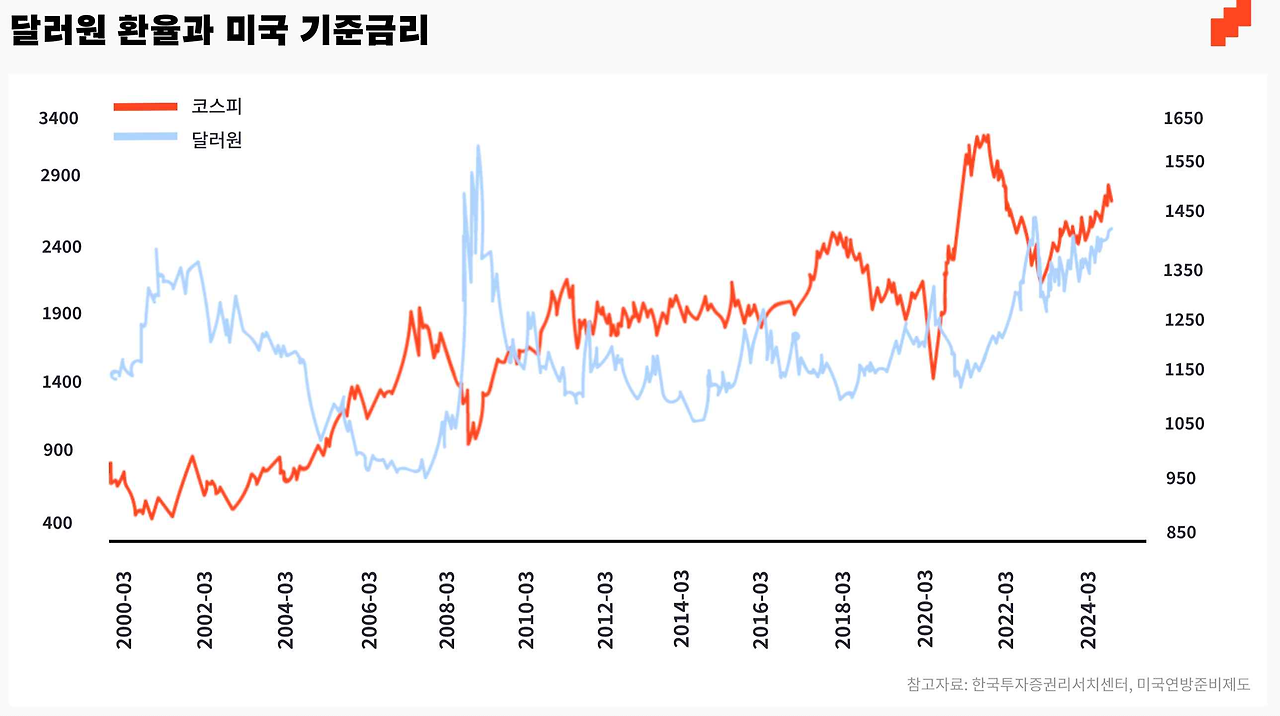 핵심은 달러가 얼마나 올랐다도 되겠지만, 코스피와 같은 다른 자산들이 무너져 내릴 때 달러가 큰 폭 뛰어올랐다는 점입니다.