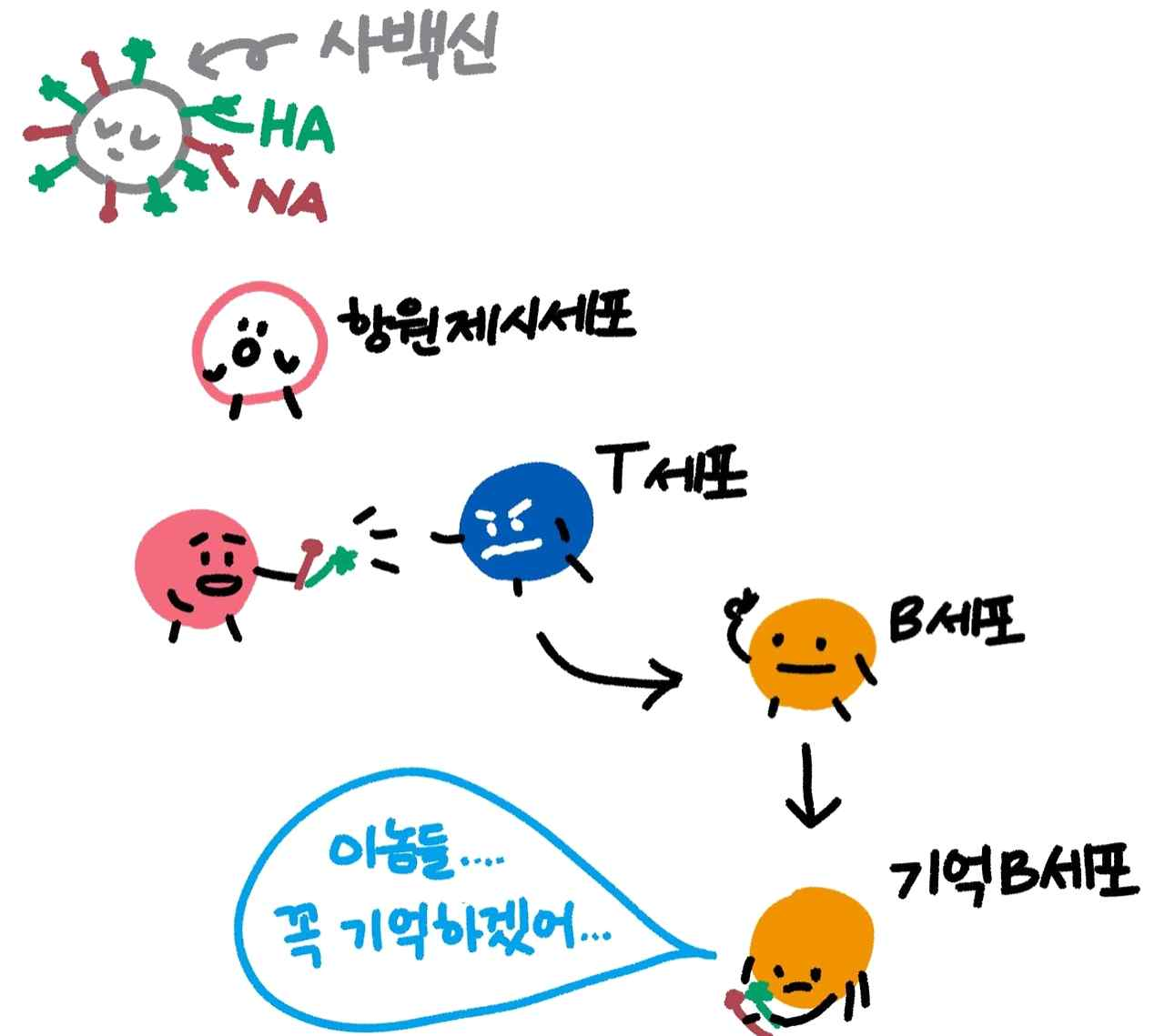 ④ T세포는 이후에 여러 면역반응을 중개하는데 그중 하나로 B cell에게도 이 신호를 전달합니다. 이후 B cell의 일부는 기억세포가 되어 이 바이러스의 표면 단백질을 기억합니다.
