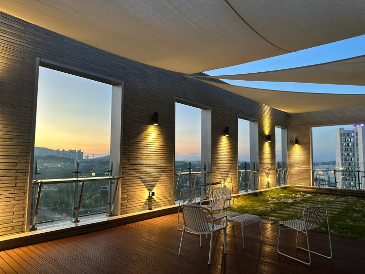 7층 체크인 라운지에 들어서는 순간, 탑동 해안이 한눈에 들어오는 전망에 그만 말문이 턱 막혔답니다. 푸른 바다와 하늘이 양옆으로 액자처럼 걸려있는 모습을 바라보고 있다 보니 약간의 해방감이 느껴졌어요.