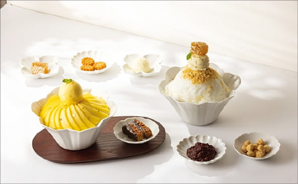 갖가지 토핑으로 완성된 다채로운 색감을 자랑하는 데다, 올라가는 토핑 자체가 핫할 때도 많습니다. 예컨대 요즘 컵빙수에는 떡과 후르츠 칵테일처럼 팥빙수하면 생각나는 전통적인 토핑 이외에도 초당옥수수, 애플망고, 젤라또 등 훨씬 다채로운 토핑이 활용됩니다.