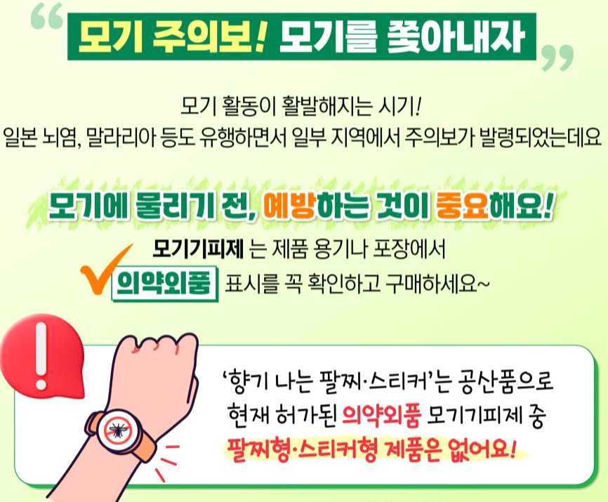 지금은 모기 활동이 활발해지는 시기입니다. 일본 뇌염, 말라리아 등도 유행하면서 일부 지역에서 주의보가 발령되었습니다. 모기에 물리기 전에 예방하는 것이 중요하며, 모기 기피제는 제품 용기나 포장에서 의약외품 표시를 꼭 확인하고 구매하시기 바랍니다.