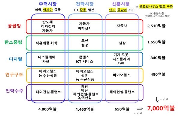 * 공급망 재편, 탄소중립, 디지털 전환, 인구구조 변화 등 글로벌 4대 메가트렌드에 맞춰 20개 주력 품목과 9개의 타깃 시장별 맞춤형 지원 전략을 마련