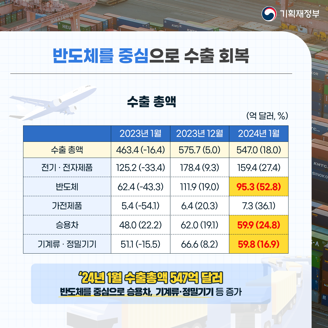 다른 품목들의 성과도 돋보였는데요, 반도체 외에도 승용차(24.8%), 기계류 및 정밀기기(16.9%)의 수출이 증가하면서 1월 수출 총액 547억 달러를 기록했습니다.