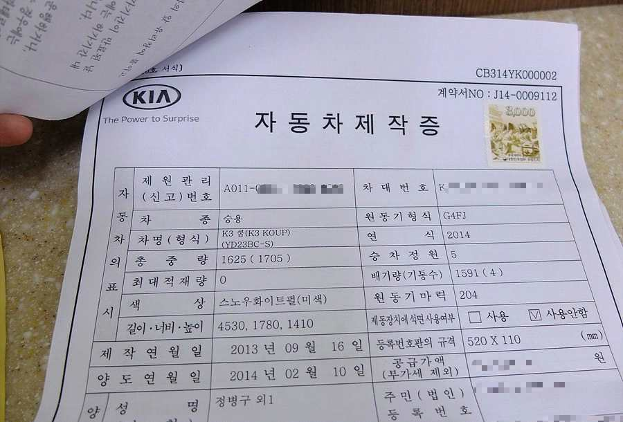 자동차 제작증에 나와 있는 가격은 부가세를 제외한 금액입니다. 따라서 부가세를 더해야 실제 구매자가 지불한 금액과 일치하며, 부가세는 일반적으로 10%입니다.