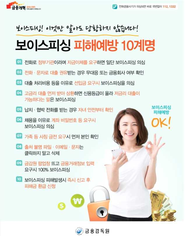 - 정부 부처, 공공기관, 금융기관 등은 어떤 일이 있어도 금전을 요구하거나, 금융 정보를 요구하거나, 앱 설치 등을 요구하지 않는 점을 기억하기