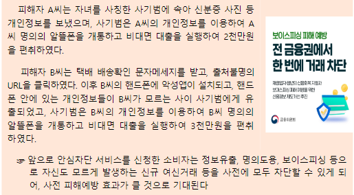 * 예시) 악성 앱 등으로 피해자의 개인정보 탈취 → 개인정보를 가지고 대포폰을 개설 → 비대면 계좌개설 및 비대면 대출 → 금전 편취
