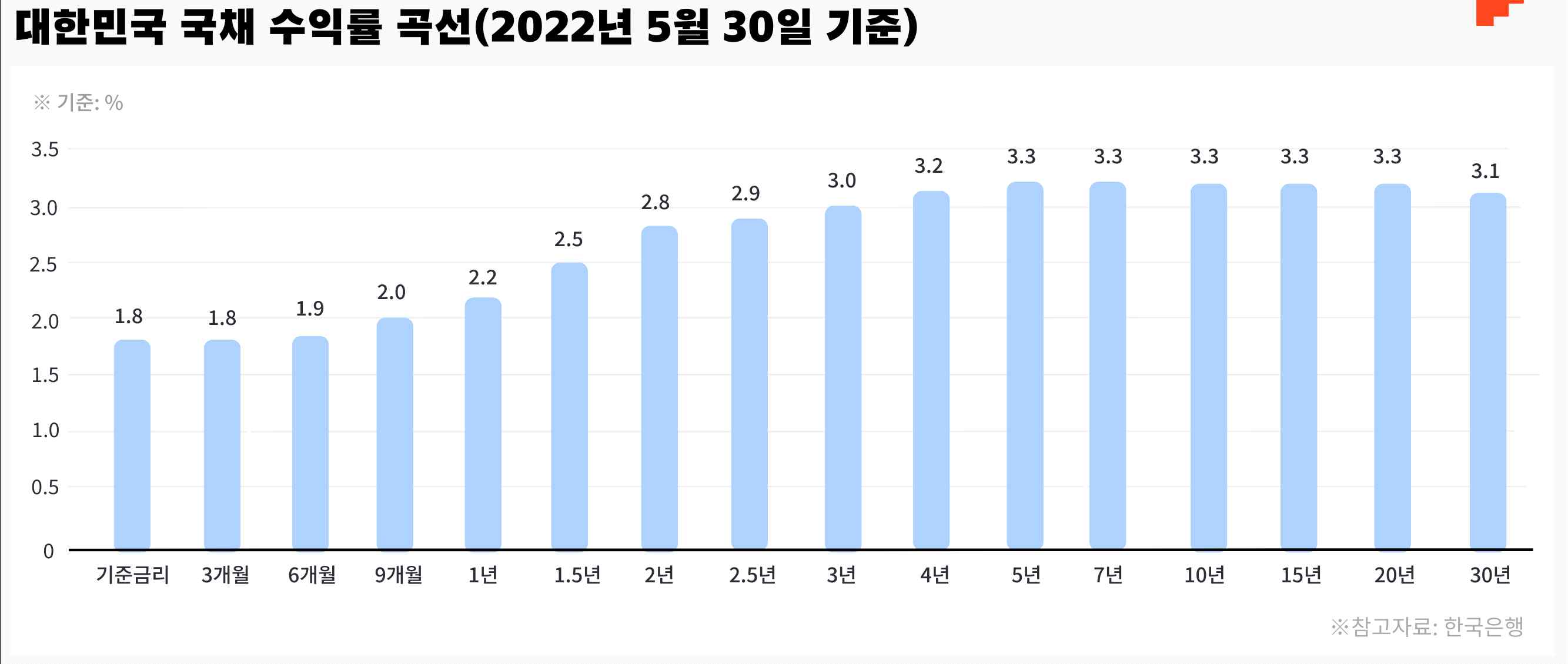 2022년 5월 대한민국 국채 수익률 곡선은, 전형적으로 우상향하는 표준적인 모습을 보여주고 있습니다. 이런 경우 만기가 긴 채권을 사면 짧은 채권보다 높은 이자 수익을 얻을 수 있습니다.