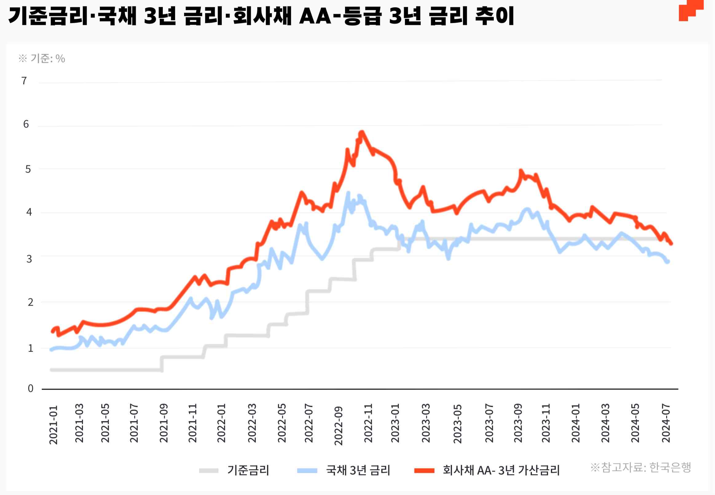 2024년 8월 7일 기준, 국채 3년 금리는 2.93%이고 AA- 3년 회사채 금리는 3.40%입니다. 즉 가산금리는 0.47%입니다. A+ 3년 회사채 금리는 3.815%로 가산금리가 0.78%입니다.
