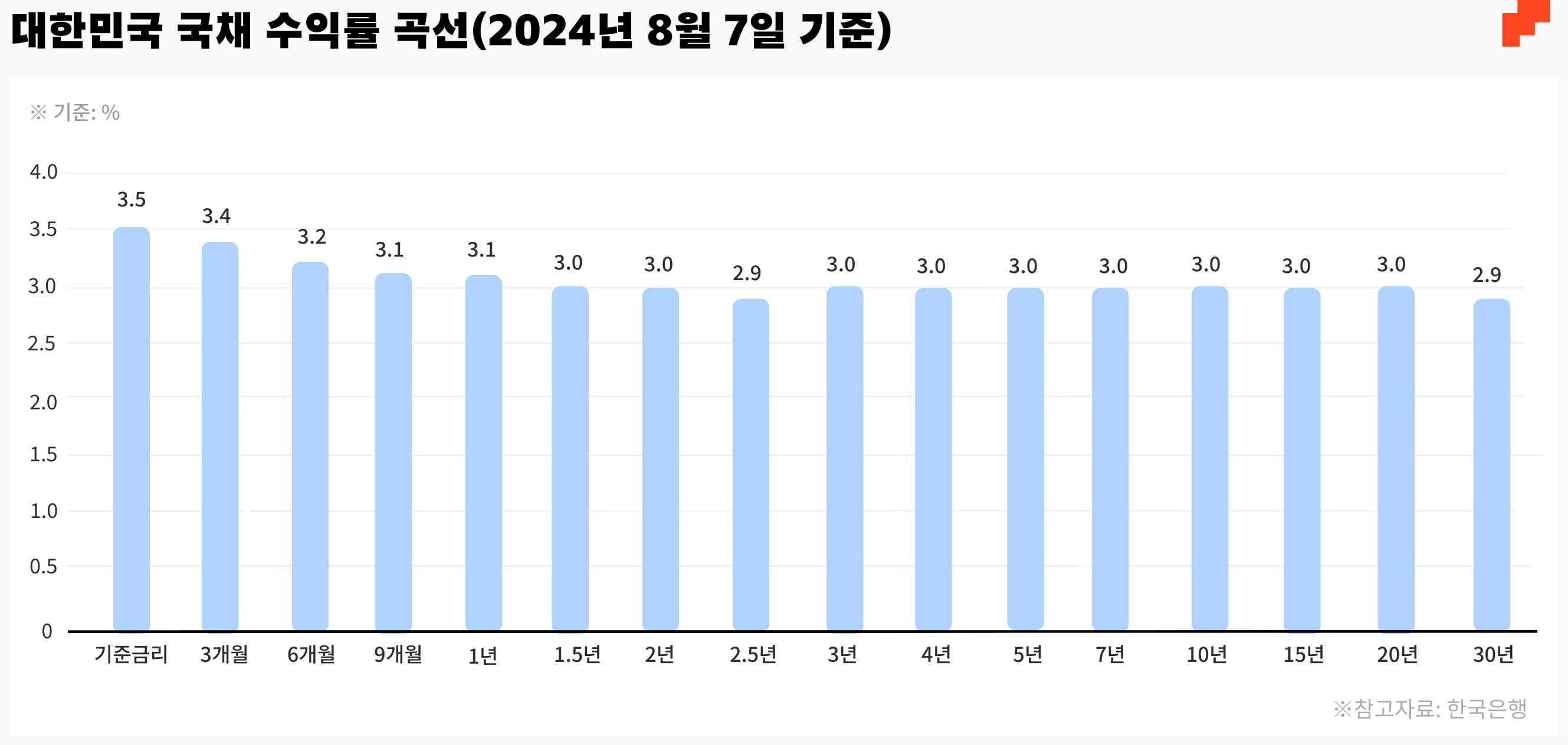 앞서 돈의 유동성을 희생하는 대가로 만기가 긴 채권의 금리가 높아야 한다고 설명했습니다. 하지만 2024년 8월 시점 모든 만기의 국채금리는 기준금리보다 낮습니다. 이를테면 현재 한국은행 기준금리는 3.5%인데 국채 3년 금리는 2.90%대에 불과하다는 것입니다.