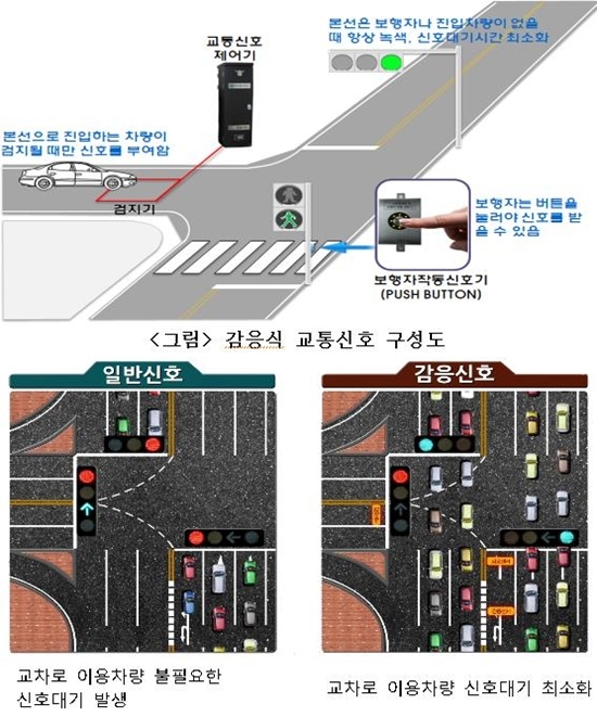 비보호 감응 신호는 교차로에 차량이나 보행자가 없을 때는 좌회전 신호를 생략하고, 차량이 감지 구간(흰색 또는 파란색 사각형, &l감응 표시)에 정차하면 센서가 이를 인식해 좌회전 신호를 부여하는 시스템입니다.