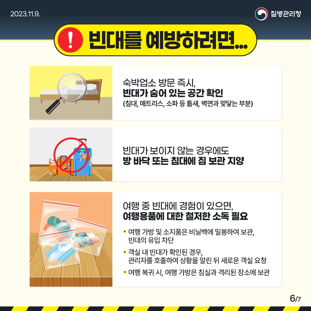 지난 11월 1일부터는 공항 출국장과 해외 감염병 신고센터에서 영국, 프랑스 등 빈대 발생 국가 출입국자와 해당 국가에서 화물을 수입하는 수입기업을 대상으로 빈대 등 위생 해충 예방수칙을 안내 · 홍보할 계획입니다.