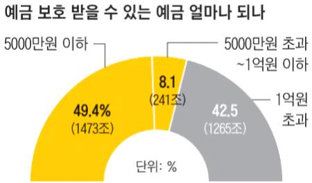 예금보험공사에 따르면 현재 국내 금융사에 맡겨진 예금은 약 3,000조 원인데, 이 가운데 약 49%인 1,473조 원이 보호 한도인 5,000만 원 이하 예금입니다. 한도가 1억 원으로 올라가면 전체 예금의 8% 정도인 241조 원이 머니 무브 사정권에 있다는 뜻입니다.