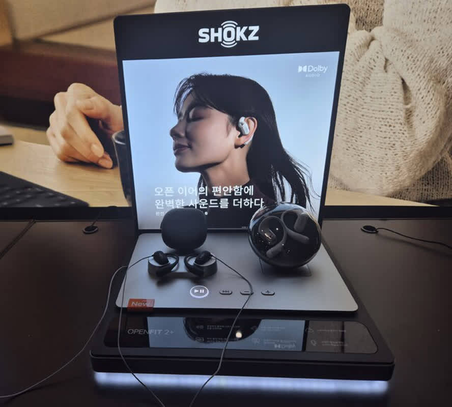먼저 체험해 본 건 샥즈에서 처음으로 선보이는 '이어 클립형' 디자인의 '오픈닷 원'이었습니다. 귀에 클립처럼 고정하는 방식이라 처음엔 좀 신기했고 무게감이 거의 없어서 깜짝 놀랐습니다.