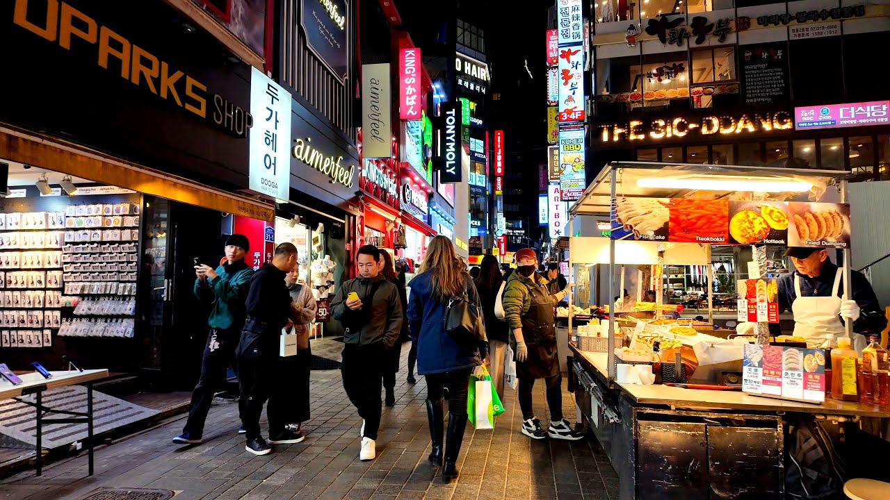 명동 거리에는 많은 화장품 브랜드, 패션 상점 및 레스토랑으로 가득합니다. 평일 오후 5시, 주말 오후 2시 명동 중앙로 한복판에 길거리 음식 노점이 등장하여 음식 골목을 형성합니다.