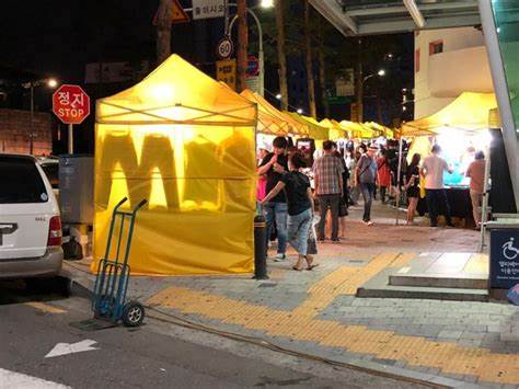 노란 천막(짝퉁 시장)은 오후 9시부터 새벽 2시까지 열립니다. 휴무일은 없으며, 우천이나 기상 악화 시에만 닫힐 수 있습니다. 물건이 많이 나오는 시간은 보통 11시쯤이며, 금요일과 토요일에는 더 많은 물건들이 판매됩니다.
