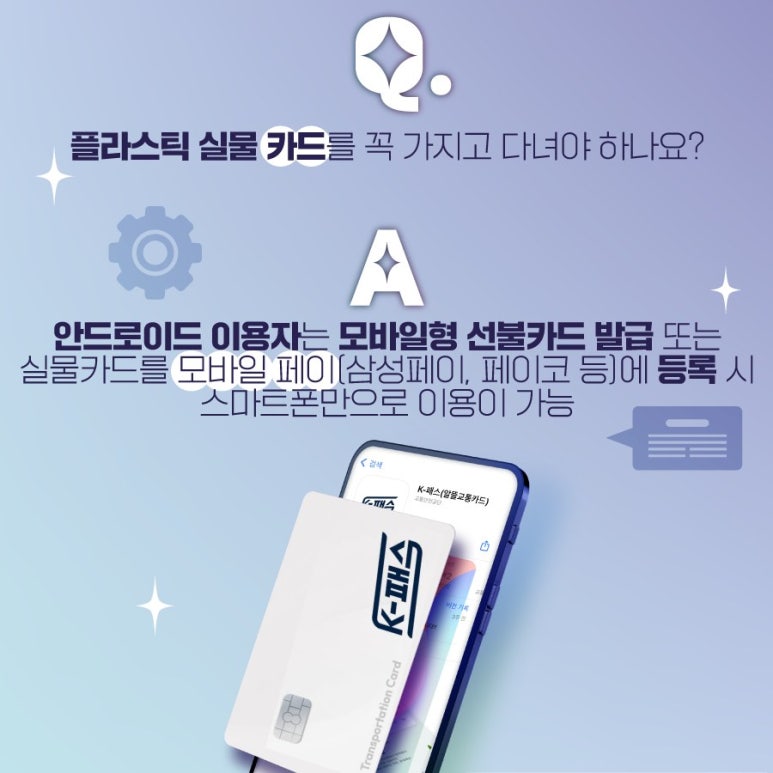 A3. 안드로이드 이용자는, 모바일형 선불카드 발급 또는 실물 카드를 모바일 페이(삼성페이, 페이코 등)에 등록 시 스마트폰만으로 이용이 가능