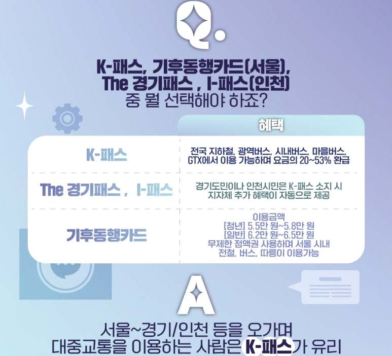 A1. 서울~경기/인천 등을 오가며 대중교통을 이용하는 사람은 K-패스가 유리